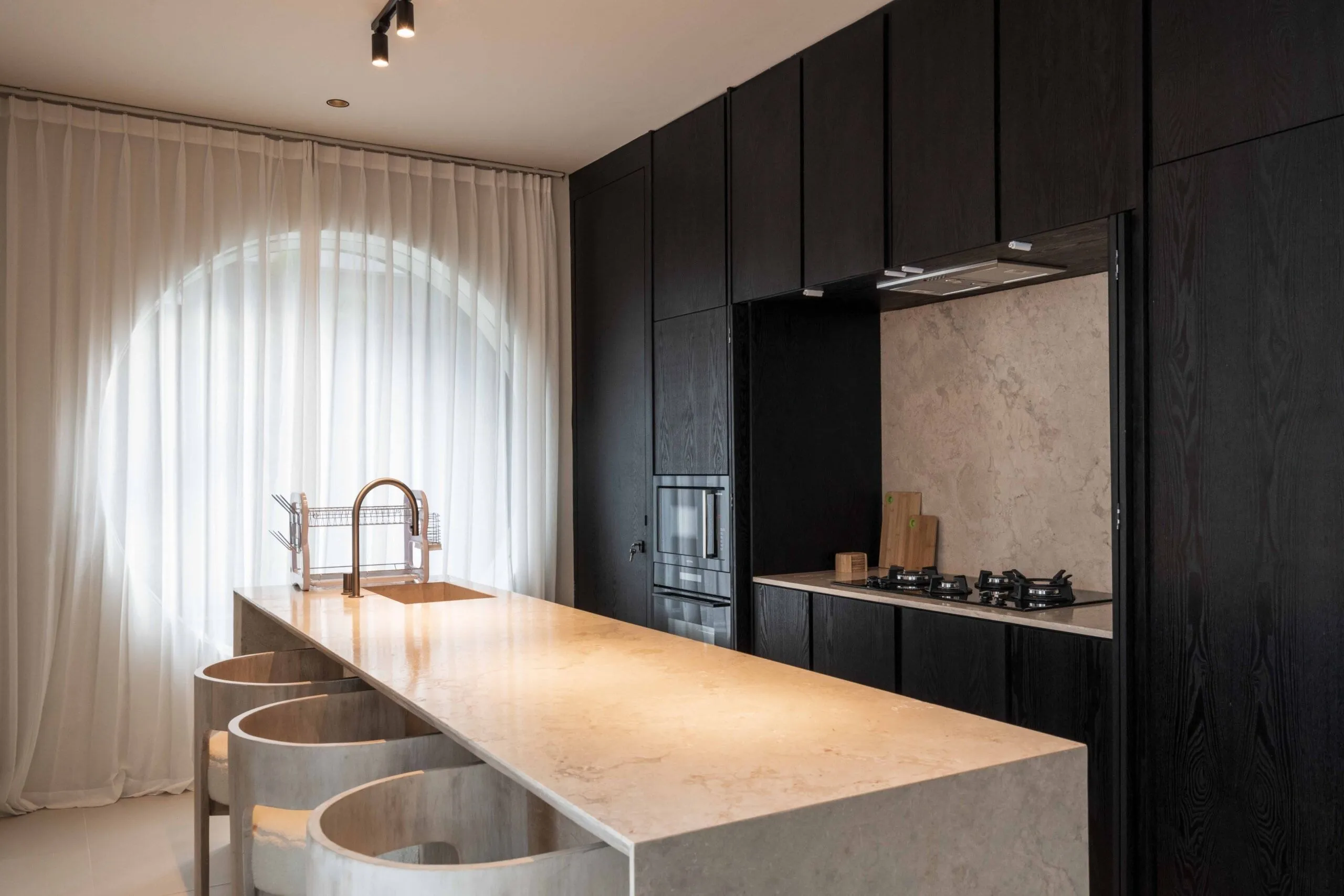 Step inside and the world softens. A neutral palette of warm creams and soft stone sets the tone. Light pours through black-framed glass doors, reflecting off the private pool just beyond the living space. The architecture is clean. Minimal. Effortlessly elegant.