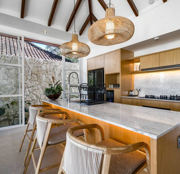 This modern 4-bedroom retreat sits among Ubud’s lush rice fields, offering the perfect mix of comfort and tranquility. Each bedroom includes air conditioning, Smart TV, and en-suite bathroom, with one featuring a unique outdoor bathtub.