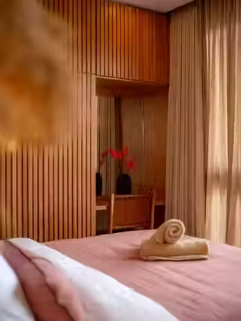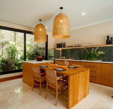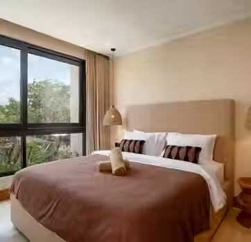 Every detail in this 2-bedroom villa has been thoughtfully crafted to create an atmosphere of calm and connection. The open-plan living room flows seamlessly to the turquoise pool, framed by lush greenery and natural stone. Inside, soft beige tones, rattan pendants and warm wooden textures create an inviting sense of warmth and ease.