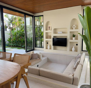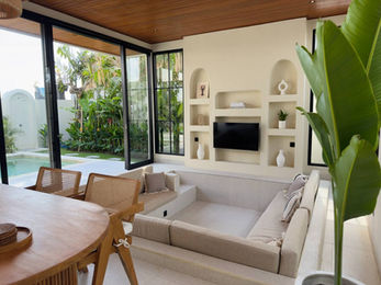 Designed with a Mediterranean-minimalist aesthetic, the villa feels warm, bright and calming from the moment you step inside. The enclosed living room is fully air-conditioned and opens seamlessly to the garden through full-height glass doors. A sunken lounge invites you to unwind, read, work or enjoy slow mornings with the soft breeze moving through the space.