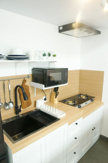 Private kitchen fully equipped with microwave, fridge, and water dispenser