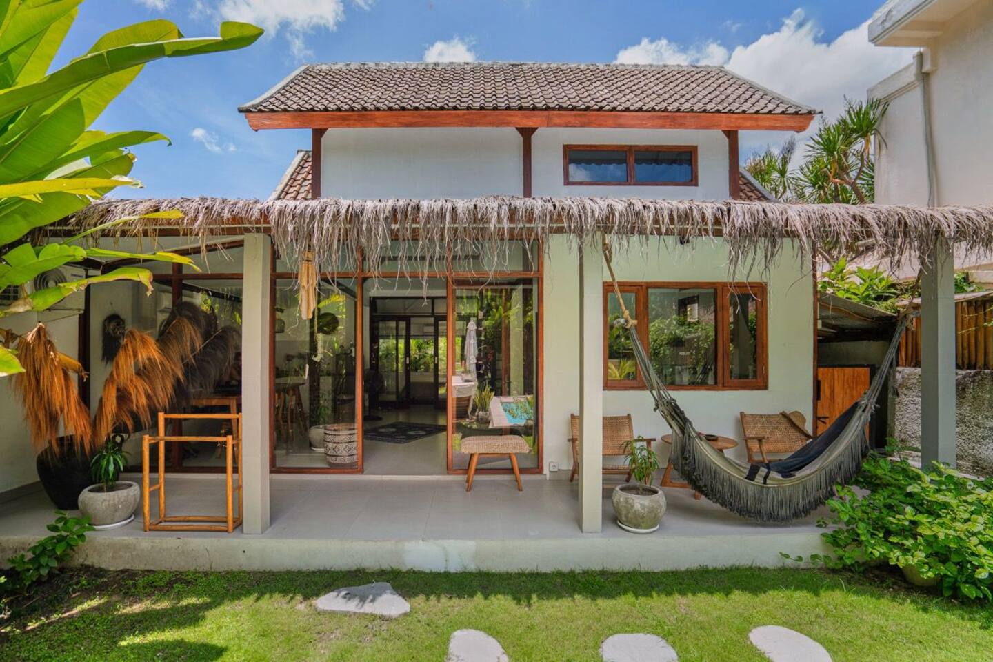 Private 1-bedroom tropical villa in Pererenan with pool, garden, work area, and flexible upstairs loft. Bright, quiet, and easy to live in, with a covered terrace, private parking, storage room, and pets allowed. Just a 4-minute walk to Pererenan Beach, with cafés and restaurants nearby. Available now for YEARLY rentals only.
