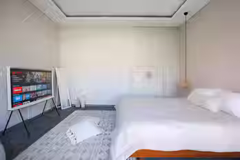 The living area is bright and modern with a comfortable sofa, Samsung Serif Smart TV and a glass coffee table overlooking the courtyard. The fully equipped kitchen includes a coffee machine, blender, juicer, and everything you need to cook or work from home with ease.