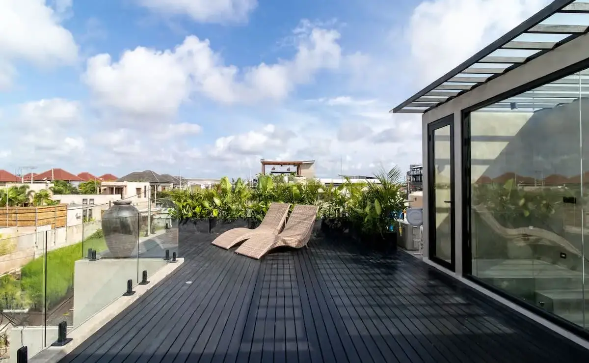 Outdoors, a private swimming pool is paired with an outdoor sunken lounge and daybeds, creating a space that feels inviting and social. The rooftop level adds a standout feature, offering open views and a relaxed setting that enhances both lifestyle enjoyment and rental desirability.