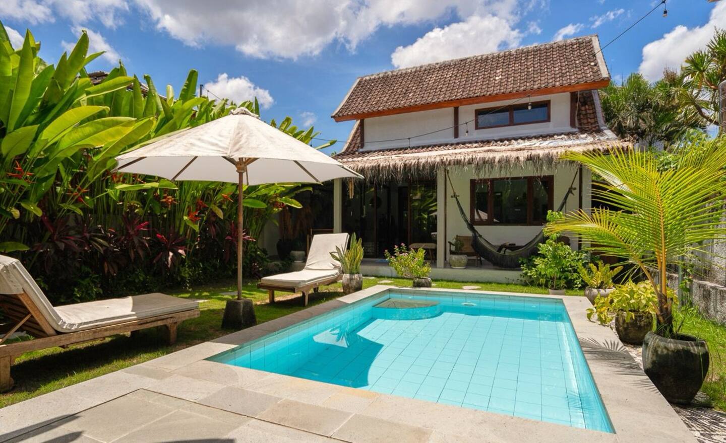 Clean, bright 2BR villa in the heart of Canggu… just steps from Copenhagen, Bali Buda & Batu Mejan. Features a private pool, sunbed lounge, AC living space, and minimalist design...